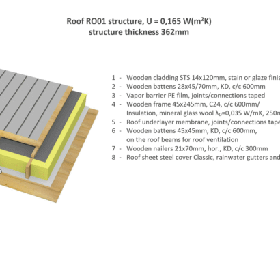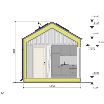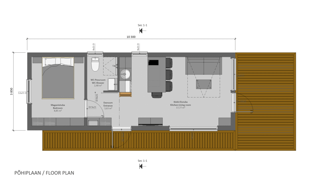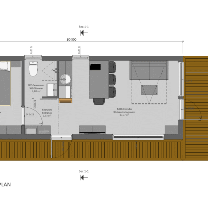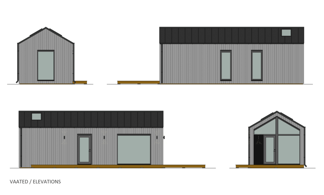 HÜTI är ett kompakt men samtidigt rymligt modulhus med sadeltak som kombinerar en genomtänkt planlösning med praktiska lösningar. Husets hjärta är det ljusa kök-vardagsrummet som skapar en trivsam miljö för vardagsliv och umgänge. Dubbelrummet är utrustat med en separat garderobsdel för ökad bekvämlighet och funktionalitet. Entrén med en rymlig garderob gör det dagliga användandet praktiskt och organiserat.